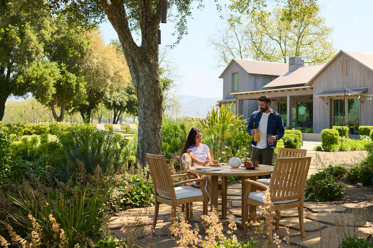 Eden was designed for our friends who love the appearance of teak furniture, but not the maintenance. Powder-coated aluminum frames are hand painted to represent the look of weathered teak.