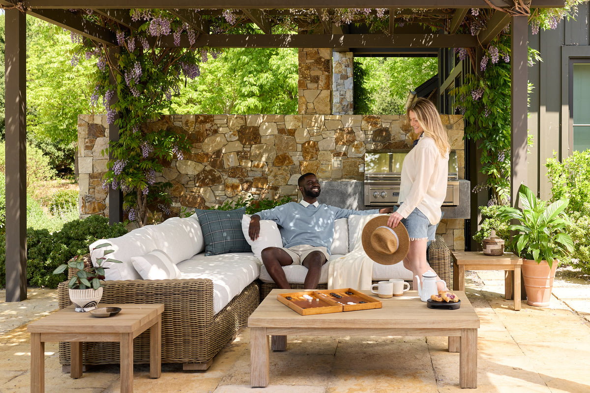 Ludlow mixes materials and textures, creating a design that feels both modern and organic. This collection boasts a low-profile frame wrapped in a light wicker with weathered teak feet and textured Sunbrella fabric.