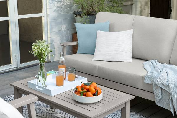Our Eden collection is made with commercial-grade aluminum that has a hand-painted powder-coat finish made to look like weathered teak.