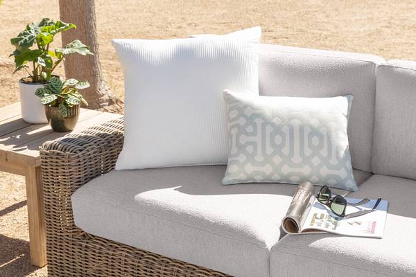 Ludlow mixes materials and textures, creating a design that feels both modern and organic. A low-profile frame wrapped in a light wicker with weathered teak feet and textured Sunbrella fabric creates visual complexity without sacrificing practicality.