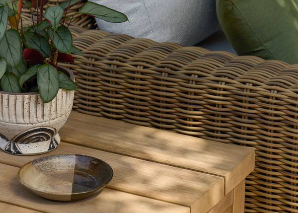 Ludlow mixes materials and textures, creating a design that feels both modern and organic. A low-profile frame wrapped in a light wicker with weathered teak feet and textured Sunbrella fabric creates visual complexity without sacrificing practicality.