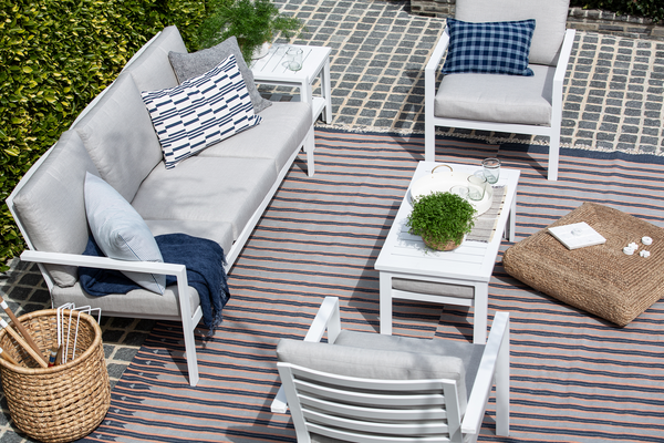 The Luna Sofa Set includes a sofa, two fixed chairs and a coffee table.