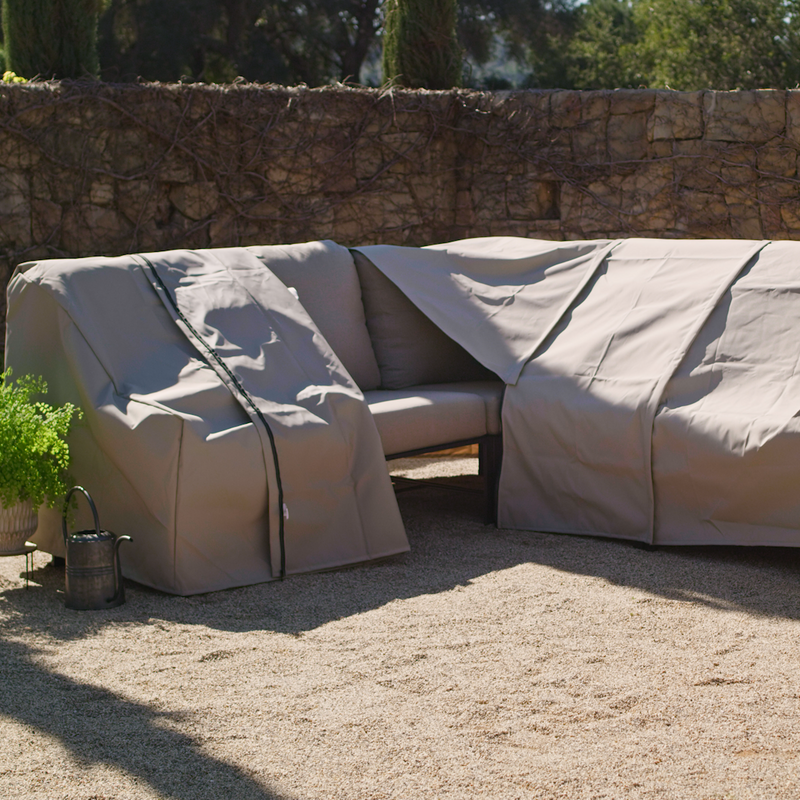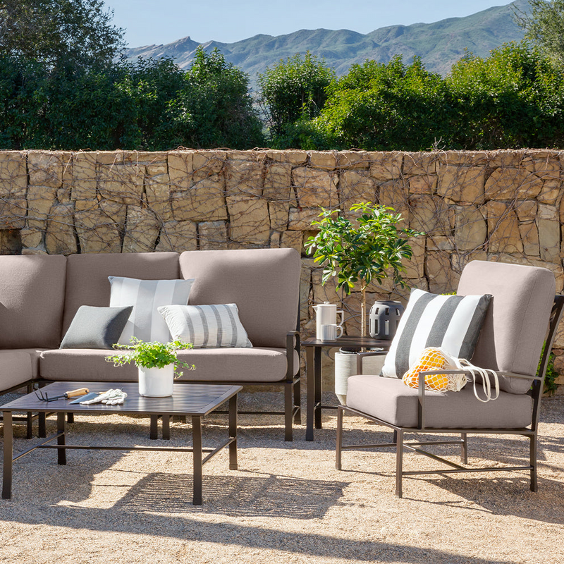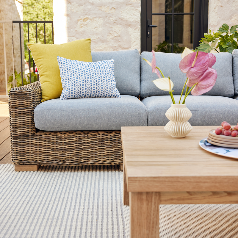 Ludlow mixes materials and textures, creating a design that feels both modern and organic. Enjoy a low-profile frame wrapped in a light wicker with weathered teak feet and textured Sunbrella fabrics.